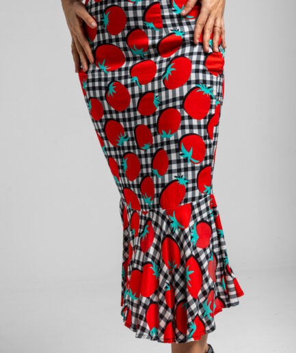 € 34,99 (IVA inc.)FALDA LÁPIZ CON GODET EN EL BAJO DE TOMATES Y VICHI BLANCO Y NEGRO – POMODORI LOLINA
