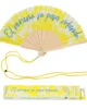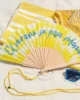 El abanico de ondas amarillas con el mensaje en azul es perfecto para darle un toque fresco y positivo a tus outfits veraniegos. Además, incluye un práctico colgador para que puedas tenerlo siempre a mano y que no se te pierda ni se te olvide. ¡Cuélgatelo y olvídate de rebuscarlo en tu bolso o mochila 🎒 cuando necesites abanicarte!