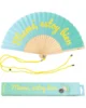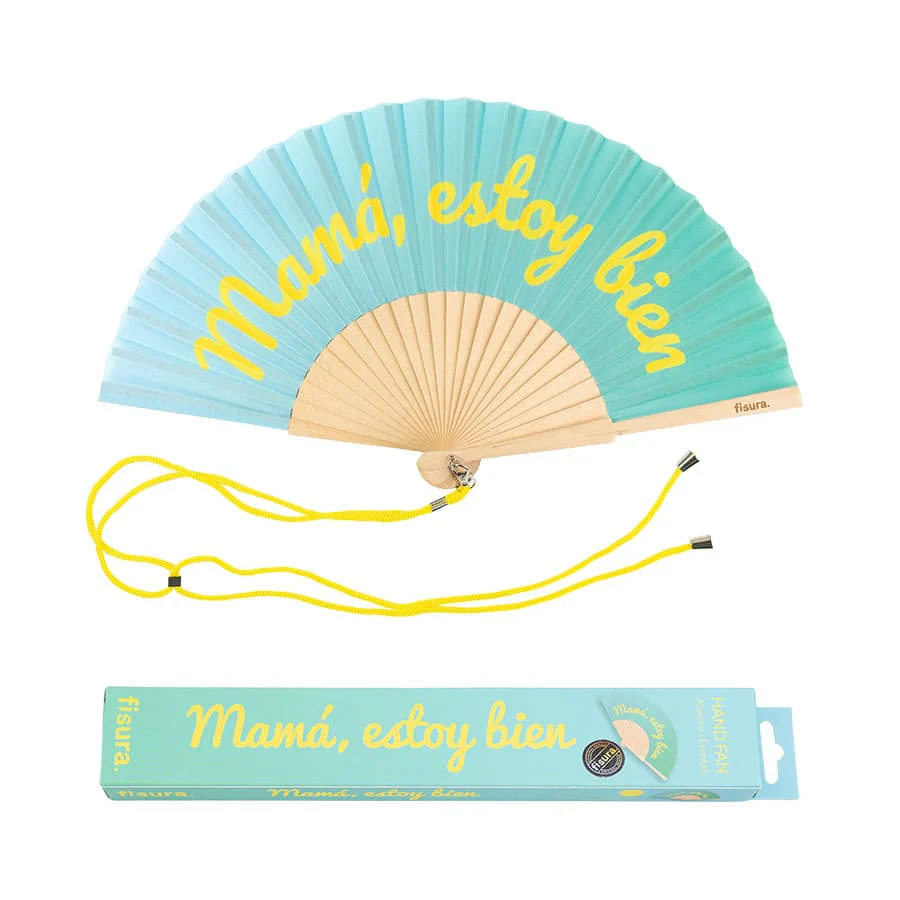 Refréscate y disfruta al máximo con este abanico original en tonos azules y amarillos que le dará a tus “looks” un toque de color. Con su mensaje “mamá estoy bien” es el accesorio de verano perfecto para tus aventuras 🎉. ¡Lleva contigo este abanico con mensaje y hazte una foto con él para que tu madre vea que estás pasándolo en grande!