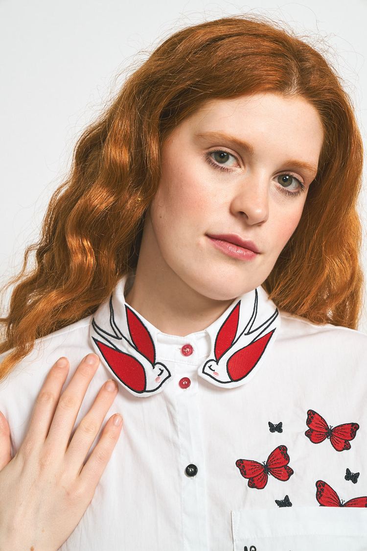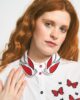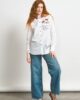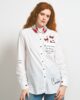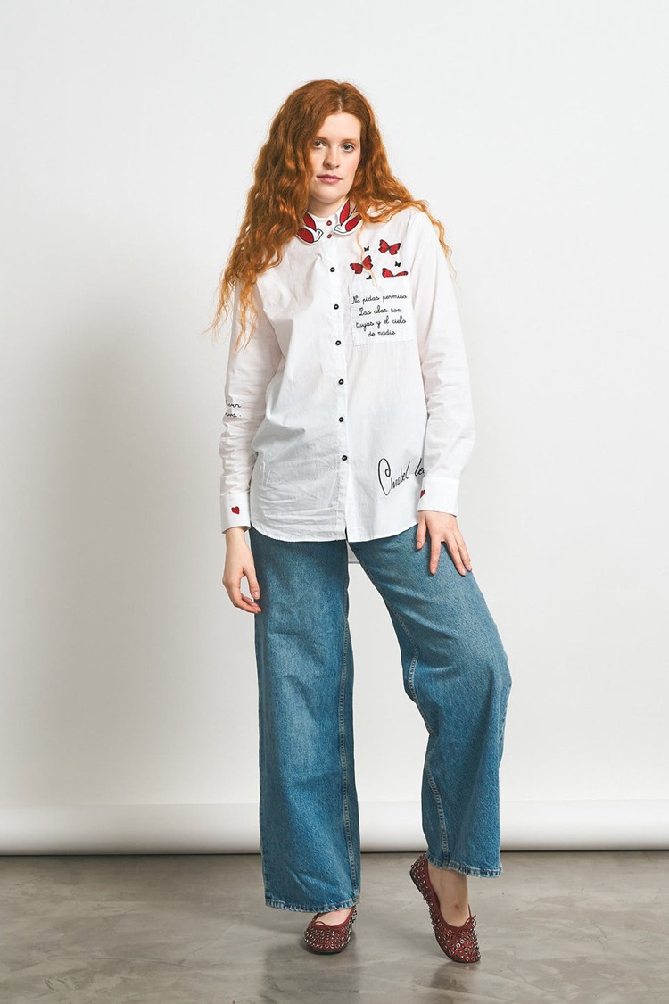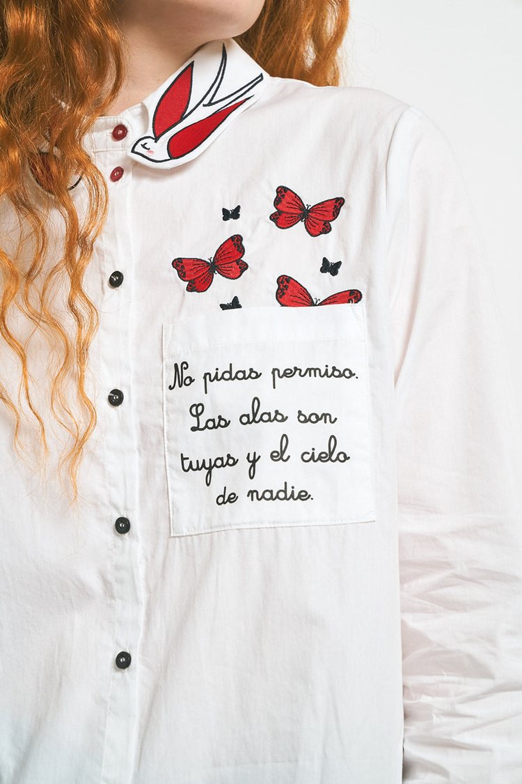 Camisa Anca – Anabel Lee. «No pidas permiso. Las alas son tuyas, y el cielo de nadie. No es vivir, es sentirse viva». Camisa de corte recto, cuello camisero con tirilla, manga larga con puño y cierre de botón. Abertura delantera con botones, bajos desiguales y redondeados, y canesú con tabla en la parte trasera. Bolsillo de plastón en parte delantera con frase estampada y mariposas bordadas sobre bolsillo. Detalle de bordadas y prints sobre la camisa.