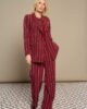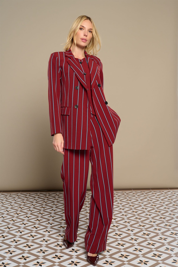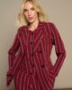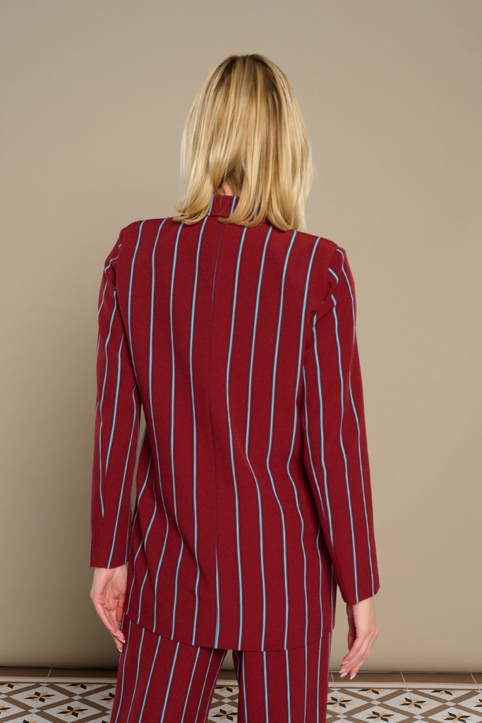 Chaqueta Bonnie Minueto. Chaqueta blazer de cuello solapa y manga larga con hombreras. Estampado de raya diplomática azul sobre burdeos. Bolsillos laterales. Cierre con botones frontales.