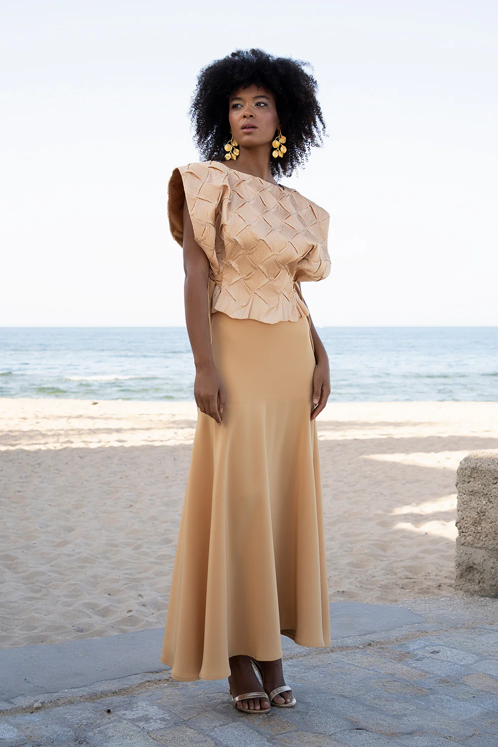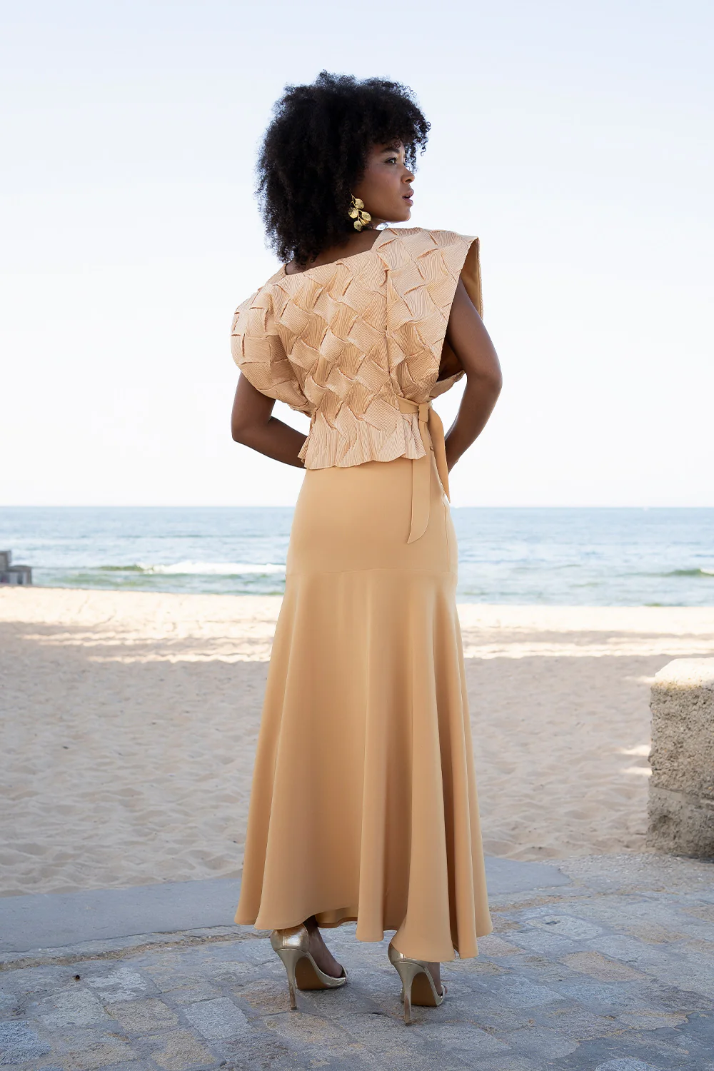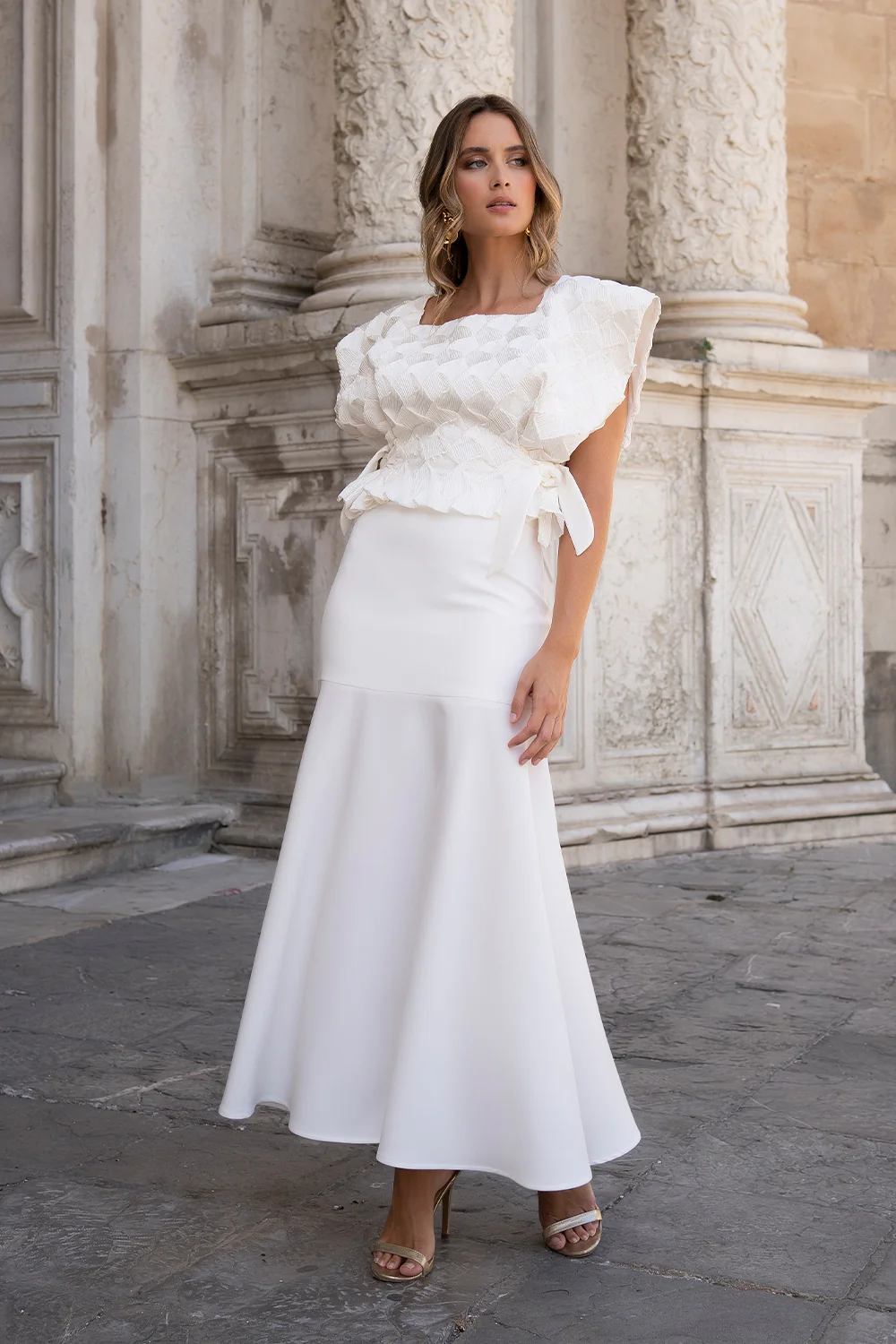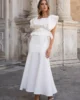 Este conjunto de top y falda midi es una propuesta sofisticada y contemporánea para mujeres que buscan una elegancia serena en celebraciones especiales. Una combinación equilibrada entre diseño, feminidad y modernidad.