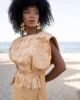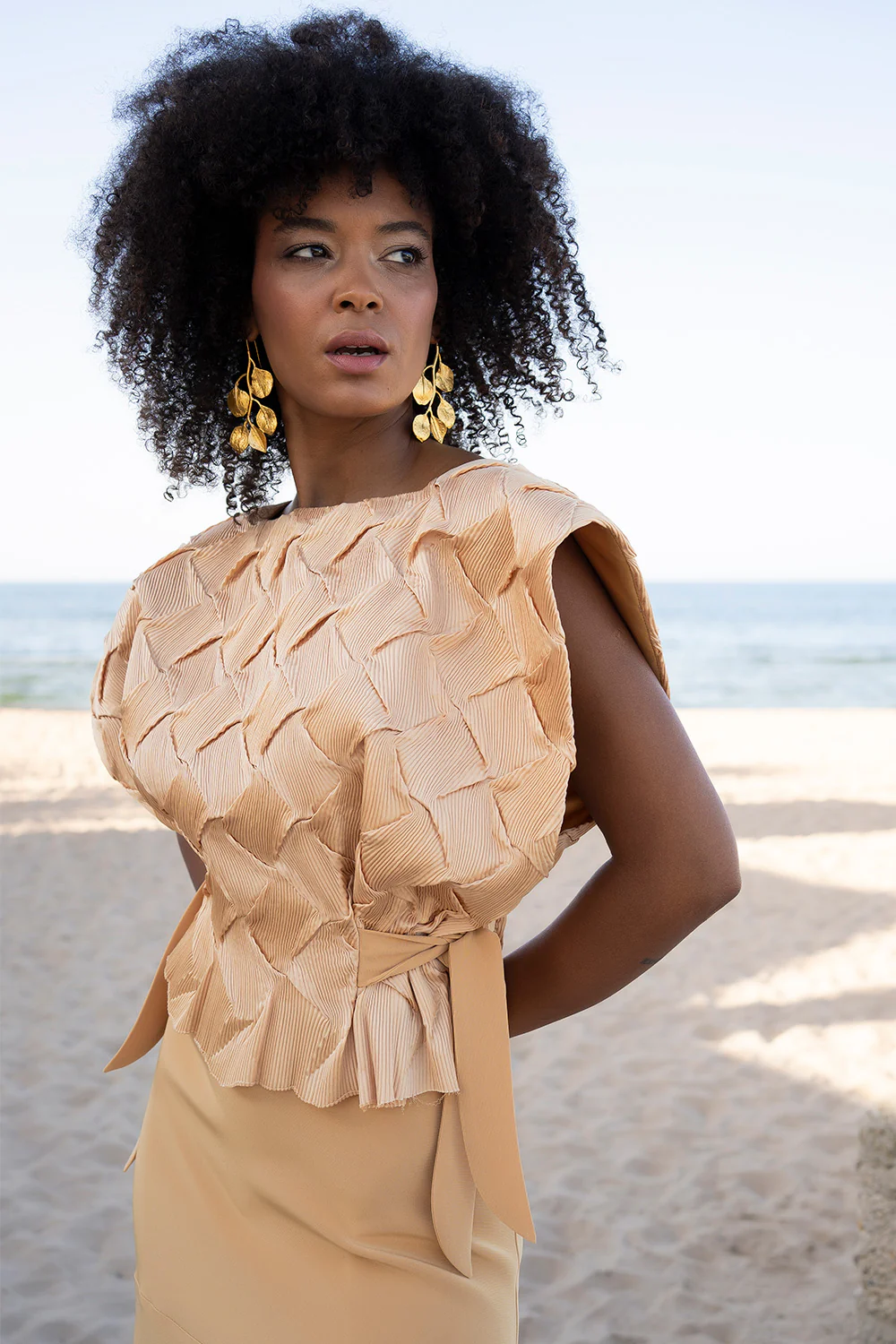 El top destaca por su cuerpo estructurado con un delicado trabajo geométrico en relieve, que aporta textura y volumen de forma sutil. Su diseño sin mangas, con hombros ligeramente marcados, realza la figura y aporta un aire actual y refinado. La lazada lateral define la cintura con delicadeza, añadiendo un punto femenino y favorecedor.