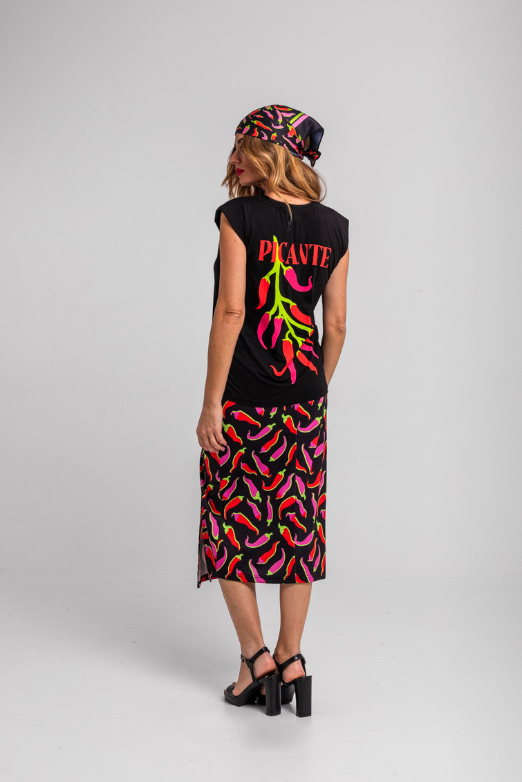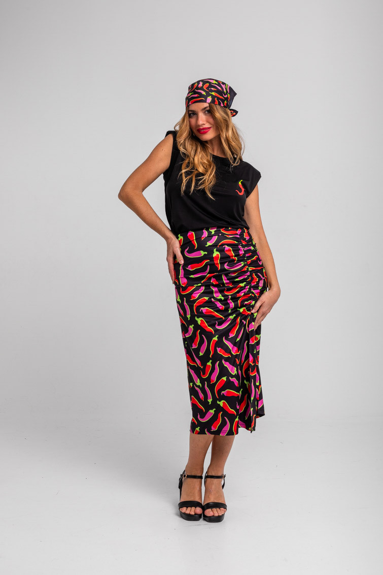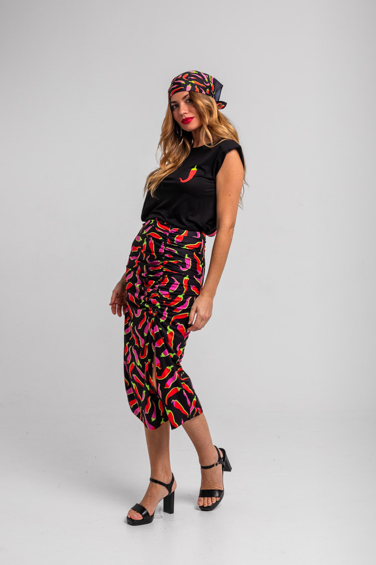 GUÍA DE TALLA FALDA DRAPEADA LATERAL NEGRA CON CHILIS ROSAS Y ROJOS PICANTE – LOLINA