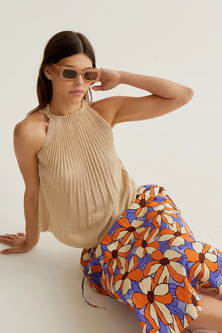 Falda midi con estampado marigold – Compañía Fantástica. Falda midi con tejido 100% algodón con cintura elástica de tiro alto ajustable con cordones.
