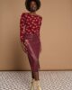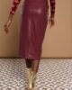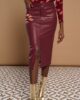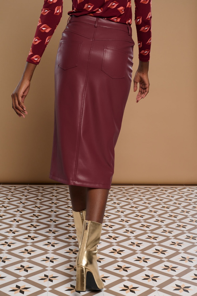 Falda Ninetta Minueto. Falda midi de polipiel en color burdeos. Detalle de labios bordados en lateral derecho. Abertura frontal. Cierre con cremallera y botón frontal. Bolsillos delanteros y traseros. Forro interior.