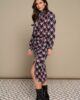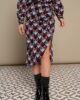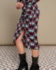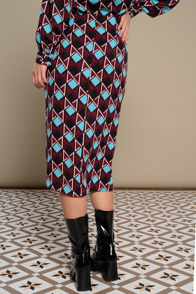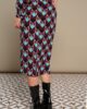 Falda Virginia Minueto. Falda midi de tiro medio con fruncido y abertura lateral. Estampado de gatos geométrico en azul. Negro y burdeos. Cierre con cremallera trasera oculta en costura.