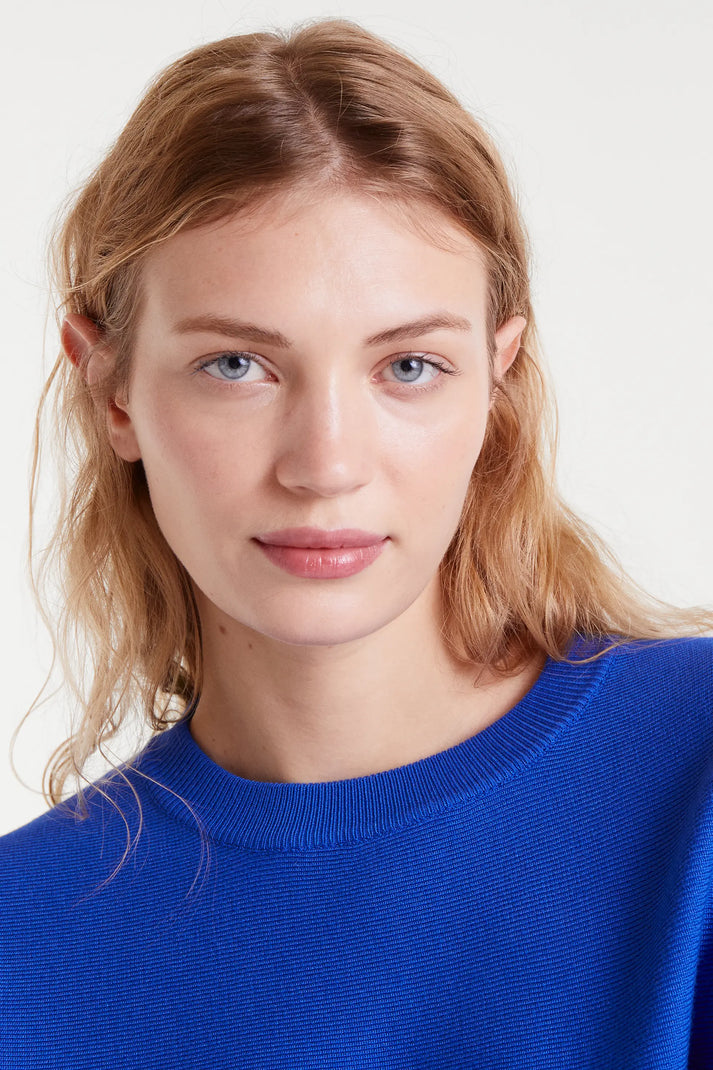 Jersey de punto evasé azul – Compañía Fantástica. Con cuello redondo y manga larga.