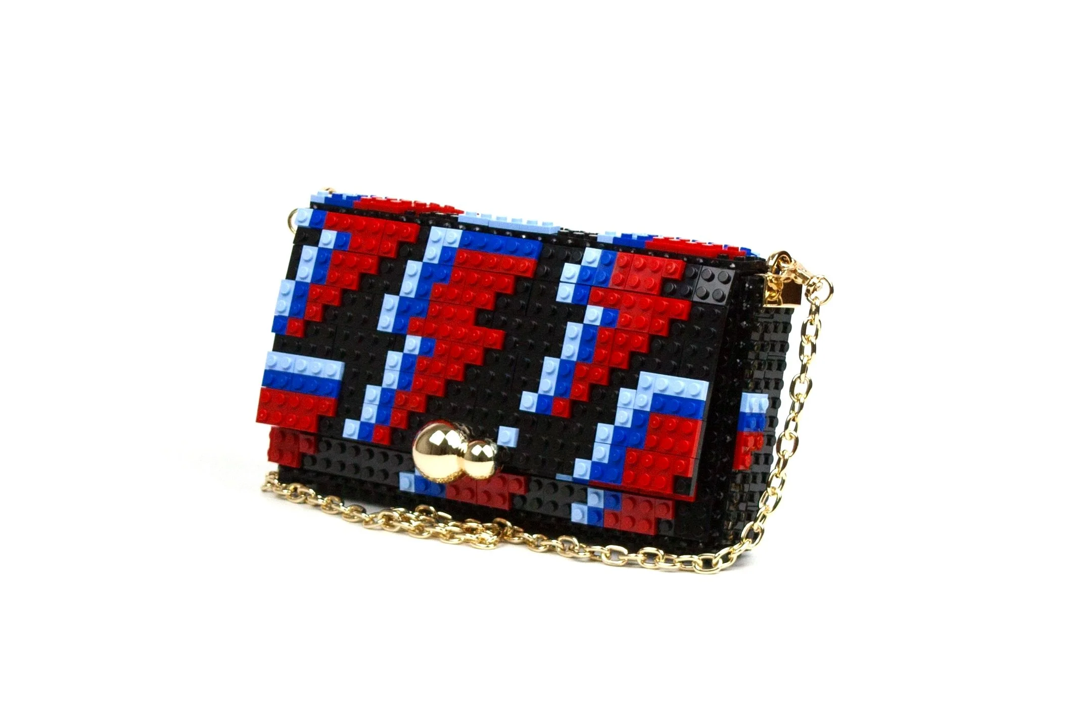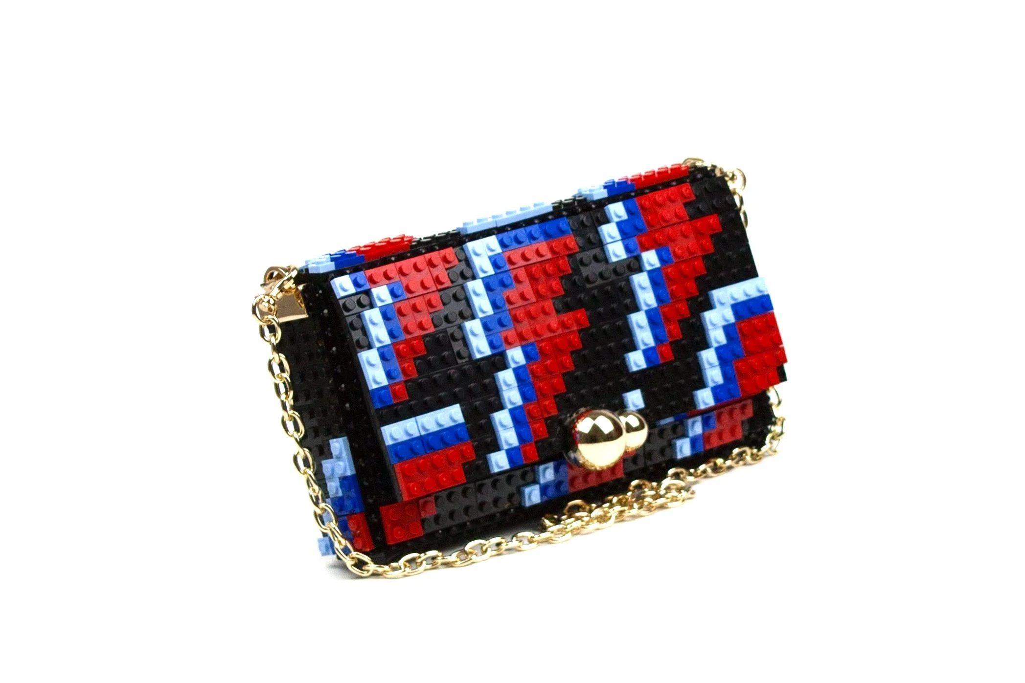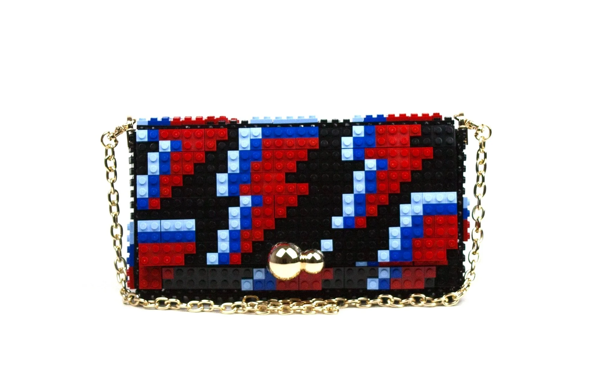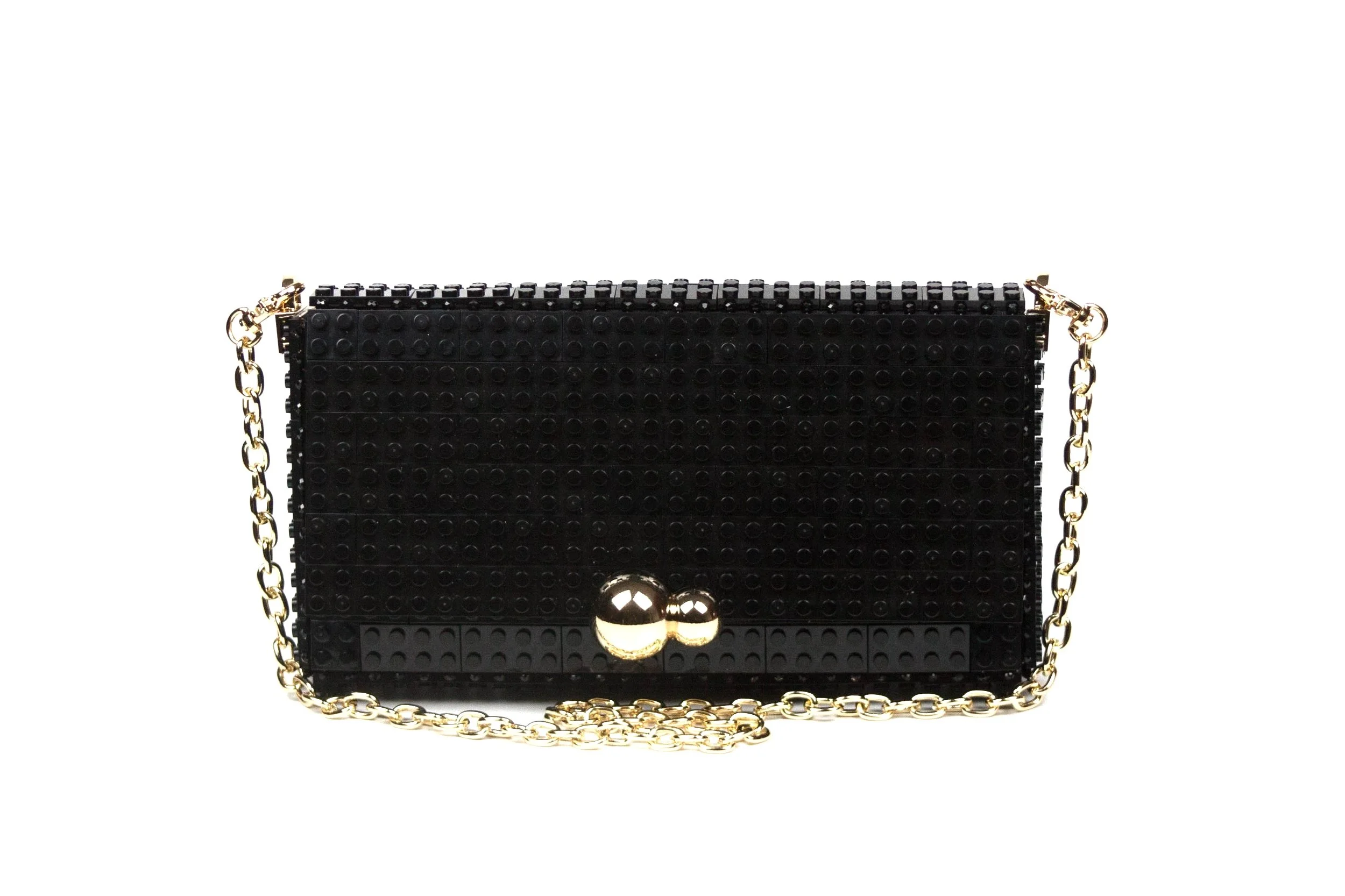 Small Squared Clutch with Stones Clasp and metallic chain, in black color customizing the design as the photo.We will ship you the bag with the design already assembled. The design blocks are in&out, so you can use them for this customization or any other, change your Bag&Block whenever you want and adapt it any time to your wish.Dimensions 25cm x 13cm x 6cm. Weight 370gr + 130gr metal chain. Fits well inside any Iphone. 196 ABS Blocks Hand Assembled + In&Out top blocks. Includes Cotton Dust Bag, inside pocket and In&Out 105cm length Metal Chain.Main Composition: ABS blocks, Glass beads and Metallic accessories. Lining Composition: 100%Polyester Satin. Top design made in Zamora (Spain). Bag base assembled in Tamil Nadu (India).Please click here to see inside and outside details from the bag.We can send you the chain length you wish according your body and how you like to wear your handbags, please check on this link our suggested lengths and add to the cart the length you wish, otherwise we will send you the