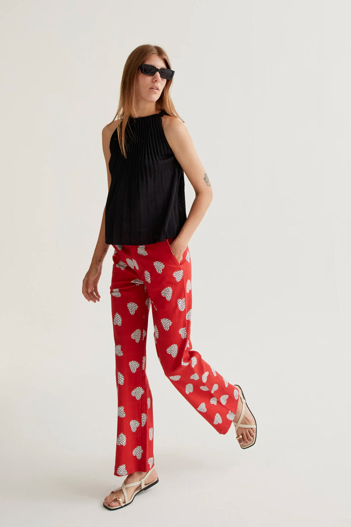Pantalón con estampado Harmony Red – Compañía Fantástica. Pantalón de tejido 98% algodón con cintura fija de tiro medio y pernera recta. Cierre frontal con cremallera y botón. Bolsillos laterales.