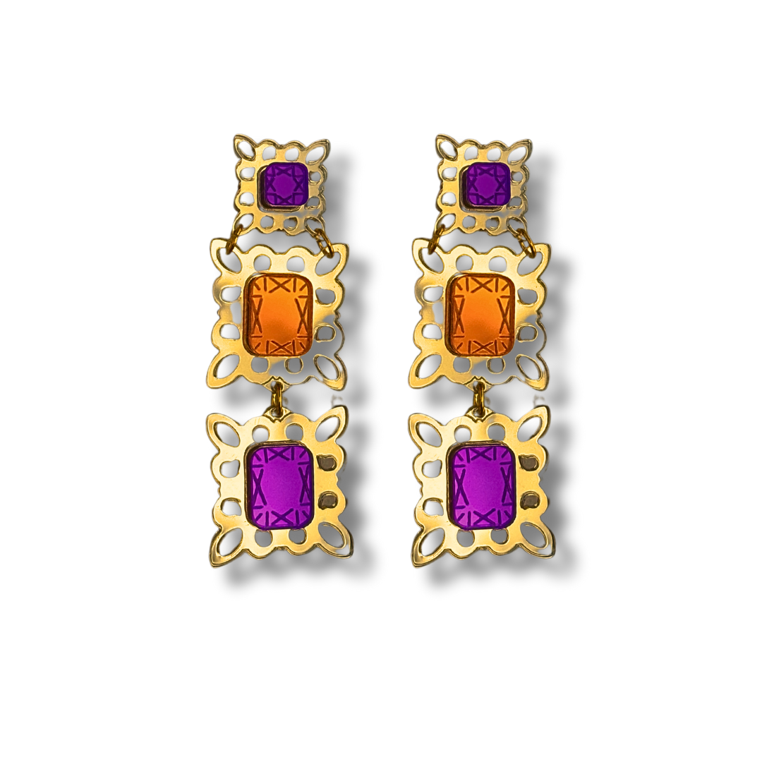El pendiente “Filigrana Cuadrado” es una pieza flamenca elegante y sofisticada, diseñada para realzar cualquier look con un toque de distinción. Fabricado en metacrilato, su estructura dorada con detalles calados de filigrana le aporta un aire refinado y artesanal. Destacan sus dos piedras de gran tamaño en colores vibrantes: una en tono ámbar y otra en un intenso morado, creando un contraste llamativo y elegante.