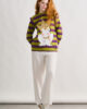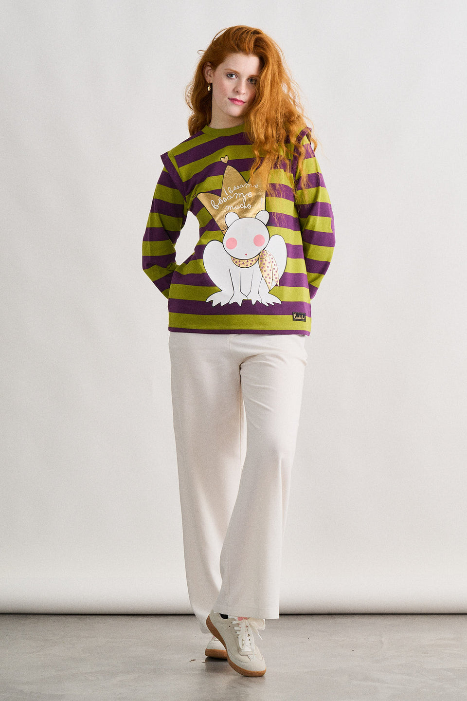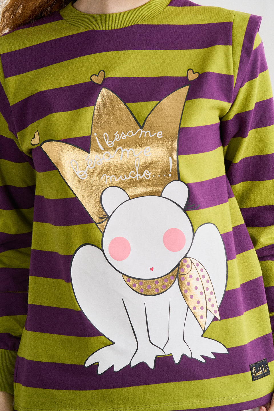 Sudadera bésame Anabel Lee. «Bésame, bésame mucho…» Sudadera de rayas, manga larga y cuello redondo. Volante pequeño sobre los hombros. Detalle de corazón en los codos. Maxi print delantero con foil dorado.