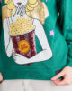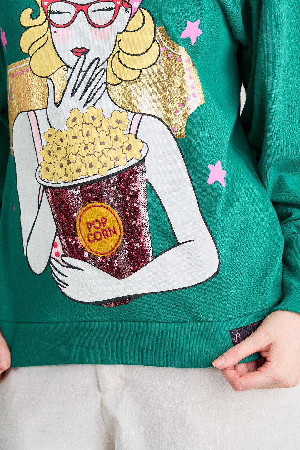 Sudadera Popcorn Anabel Lee. «No me cuentes películas». Sudadera de corte recto, manga larga y cuello redondo. Pliegues en el hombro y puños extra largos. Detalle de frase bordada en hilo dorado. Maxi print delantero con lentejuelas y foil dorado.