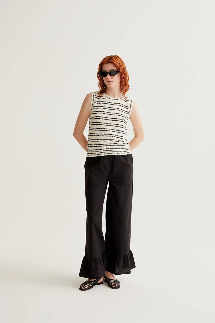 Top de punto texturizado con rayas negras – Compañía Fantástica. Top de tejido punto suave y ligeramente texturizado con rayas de color negro. Cuello redondo y sin mangas. Detalles acabados en rib.