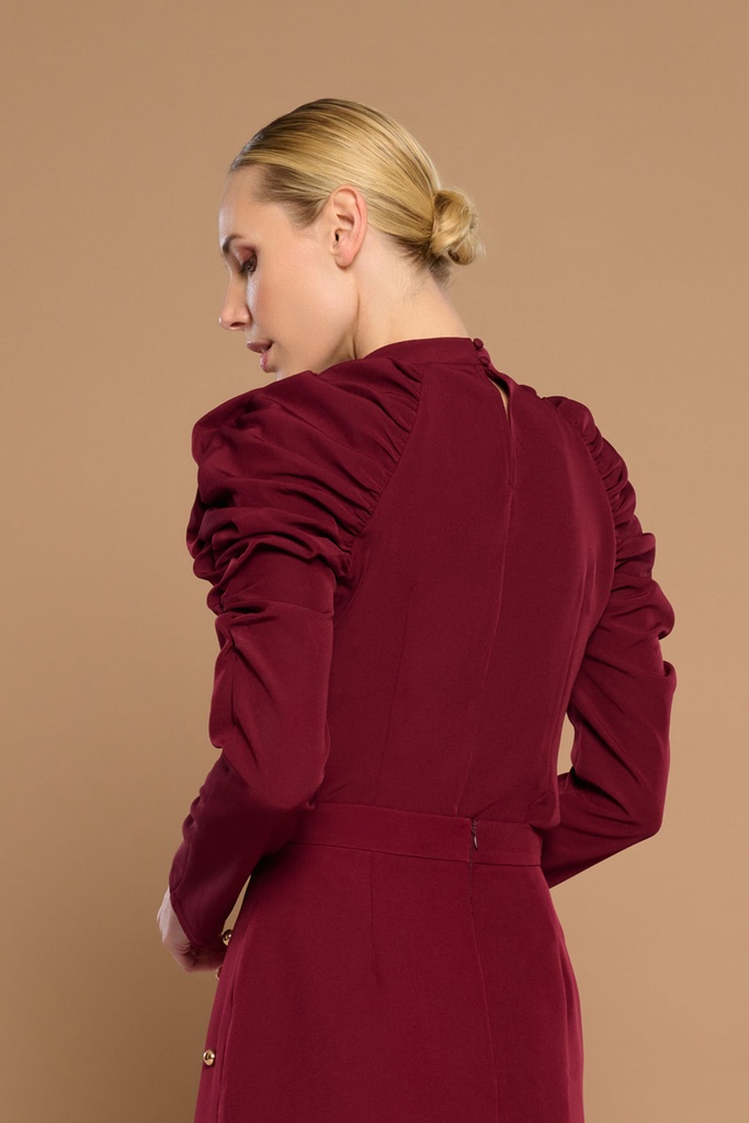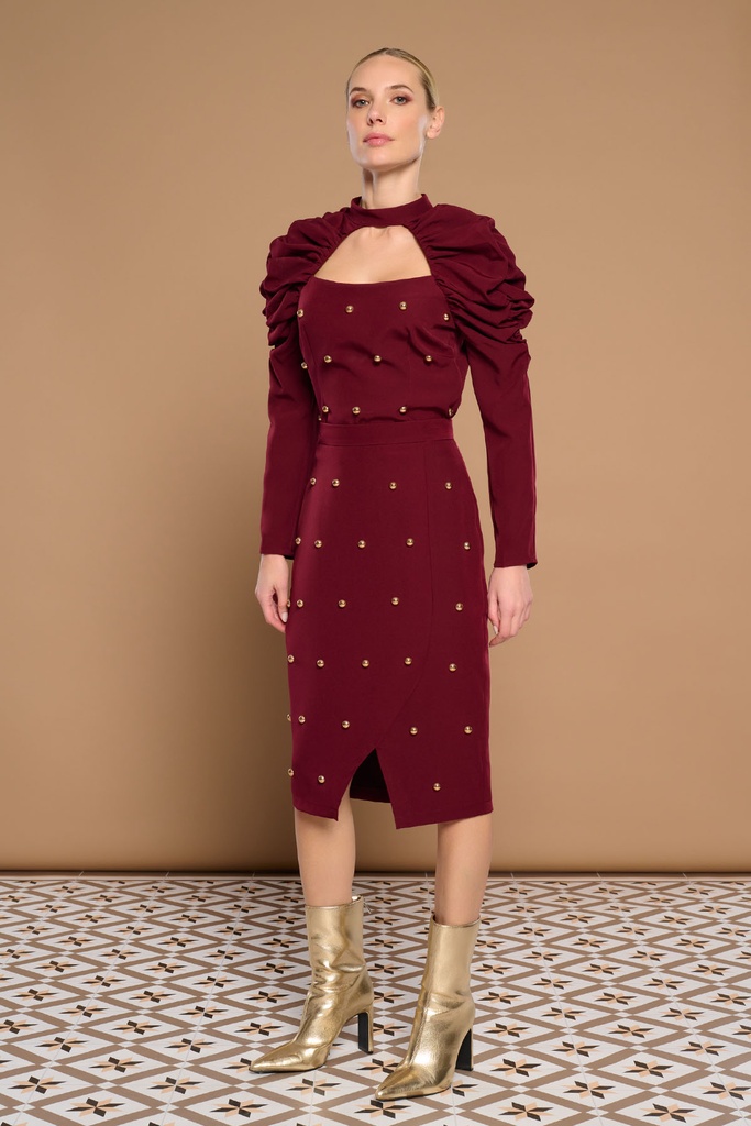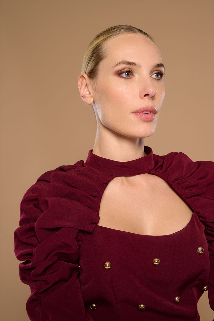 Top Isabella Minueto. Top de cuello choker y abertura cut-out en escote cuadrado. Hombros fruncidos. Detalle de cuentas doradas cosidas en frontal. Cierre en espalda con abertura y botón.