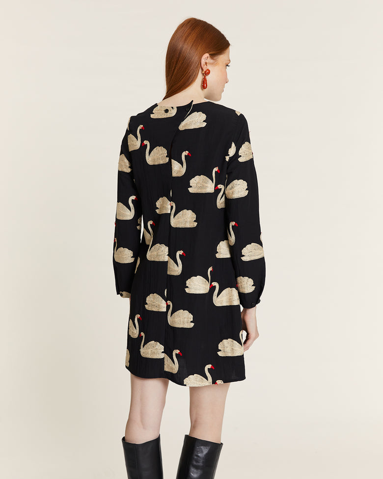 Vestido corto bordado cisnes – Pepaloves. Mangas largas rectas con puño abotonado, por debajo de la cadera.