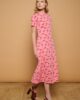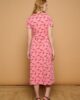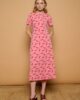 Vestido Gecko Minueto. Vestido midi de cuello redondo y manga corta. Tejido elástico de algodón. Estampado de sargantanas sobre fondo rosa.
