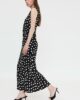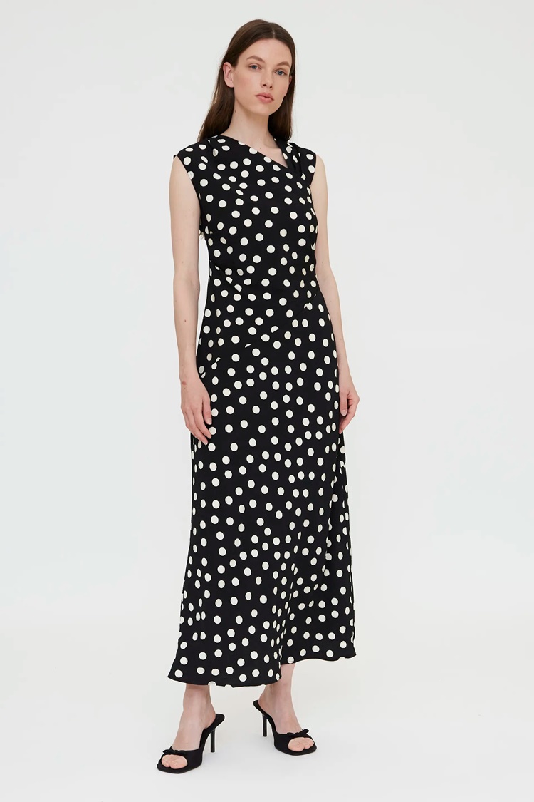 Vestido largo con estampado de punto negro y blanco – Wild Pony. Vestido largo de tejido crepé con estampado de puntos irregulares negro y blanco. Cuello pico asimétrico con cortes irregulares y sin manga.
